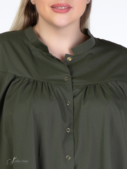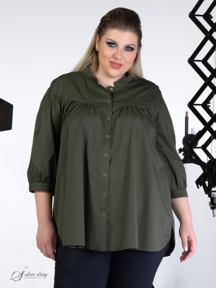Блуза трапециевидного силуэта с воротником – стойкой и застежкой на кнопки. Модель выполнена из эластичной ткани с высоким содержанием хлопка. Особого внимания заслуживает отличное качество ткани. Переплетение нитей в полотне, придает материалу шелковистость и легкий блеск. По полочке и спинке проходит отрезная кокетка, переходящая на окат рукава. От линии кокетки, по центру спинки и на полочке, заложена легкая сборка. Рукав, длиной 3/4, обработан манжетой. Объем манжеты можно регулировать за счет парных кнопок. Это оригинальная модель, которая прекрасно впишется в Ваш гардероб и подарит настроение и комфорт.