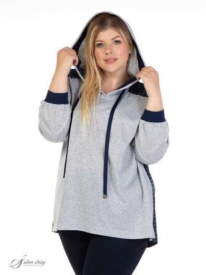 Эффектный блузон прямого силуэта, в спортивном стиле, выполнен из материалов-компаньонов: однотонного трикотажного полотна и ткани с рисунком в клетку. Модель с капюшоном и длинным втачным рукавом. Лицевой вырез капюшона обработан планкой контрастного цвета, и в нее вложен шнур – затяжка. На полочке расположены кокетки. Низ рукава присобран на трикотажную манжету. Модель выполнена с учетом особенностей фигуры полных дам и позволяет обеспечить отличную посадку и максимальный комфорт.