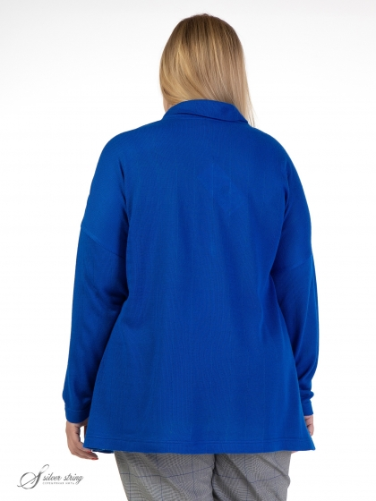 Эффектный джемпер свободного силуэта выполнен из фактурного однотонного трикотажного полотна. Модель с удлиненной линией плеча и воротником - «гольф». Рукав длинный, суженный к низу. Линия плеча декорирована термоаппликацией из миниатюрных страз с анималистическим рисунком. Модель выполнена с учетом особенностей фигуры дам нестандартных размеров, позволяет подчеркнуть их достоинства и завуалировать возможные недостатки.