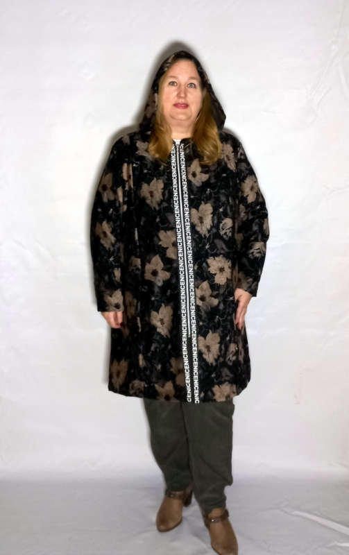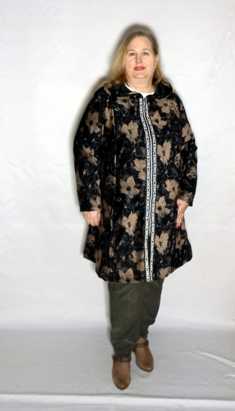 Стильный кардиган-ветровка выполнен из шанель-велюр полотна с интересным принтом. Для отделки использовали тесьму с надписями.
