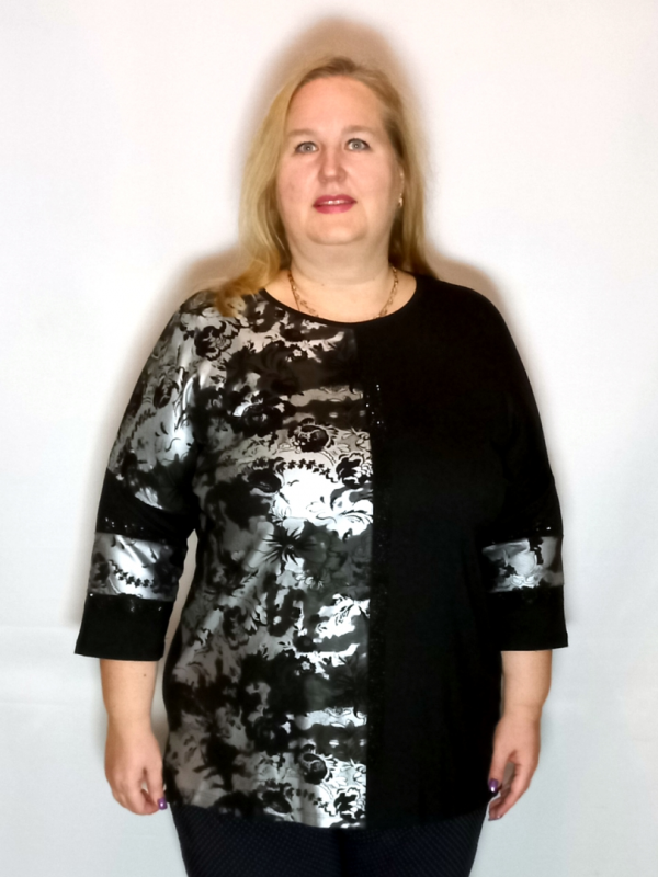 Рукав 3/4, спущенное плечо, декорирован вставкой из трикотажа с принтом и термостразами черного цвета
