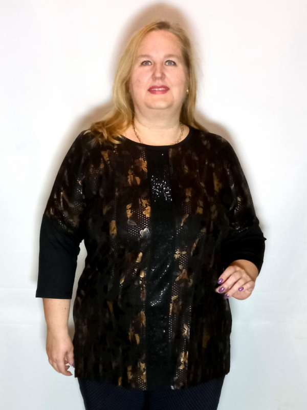 Полочка сложнокроенная, основная часть из трикотажа с рисунком, по середине вставка вертикальной полосы из однотонного трикотажа, которая декорирована черными термостразами.