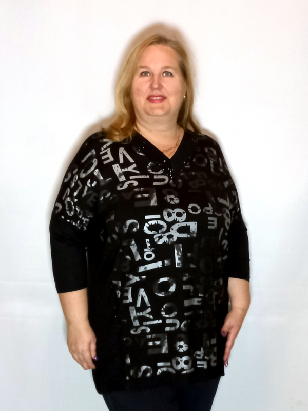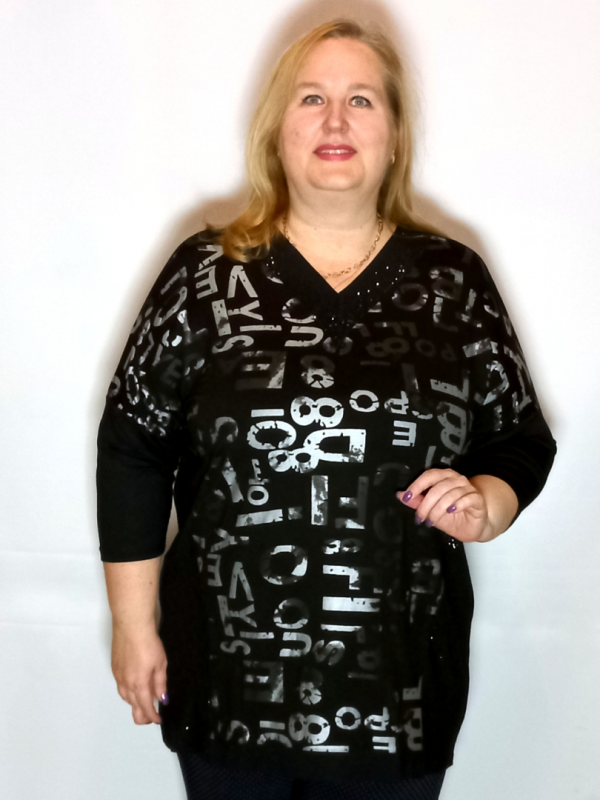 Полочка сложнокроенная: боковые вставки черного цвета, декорированы черными термостразами. Средняя часть полочки из принтованного трикотажа.