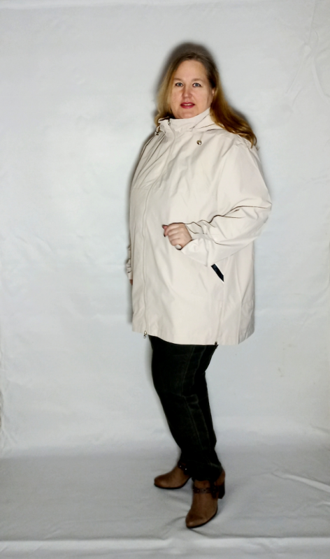 Глубокий капюшон, отстегивается. Внутренняя его поверхность из ткани с рисунком ( такой же декор  на рукавах и на полочке вставка в области карманов.