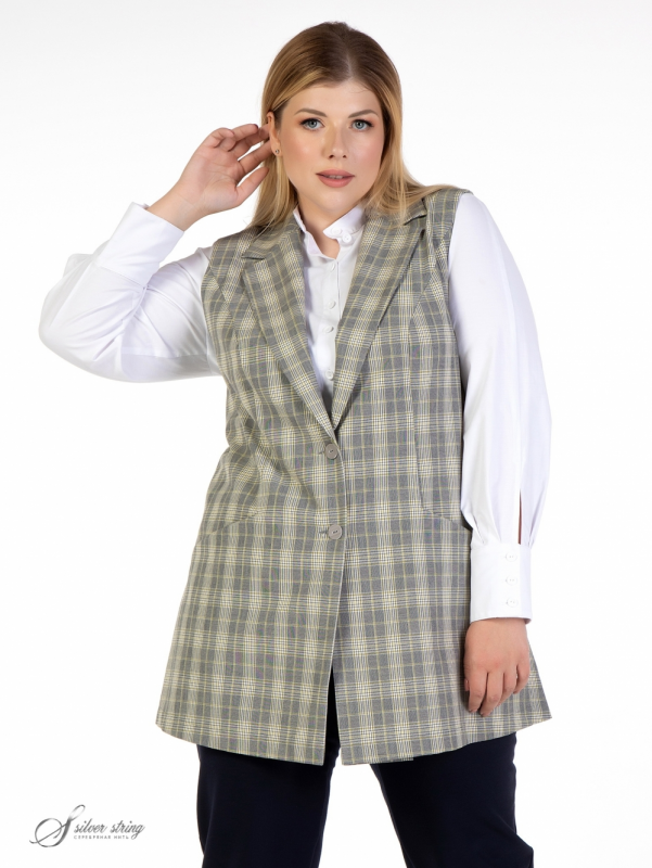 Стильный, удлиненный жакет прямого силуэта выполнен из натуральной смесовой ткани с рисунком в клетку. Модель в стиле smart-casual, с английским воротником на углубленной горловине и застежкой по борту на две пуговицы. Пройменные рельефы, ниже уровня талии, переходят в подрезные карманы. В боковых швах обработаны высокие разрезы. Модель отлично скрывает проблемные зоны и отлично дополнит любой гардероб. Жилет можно носить и с джинсами и с классическими брюками.