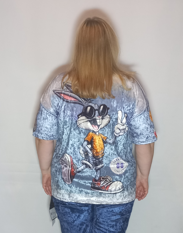 Шикарная туника- футболка выполнена из мягкого, очень эластичного мраморного велюра с рисунком амбре и тканным принтом.