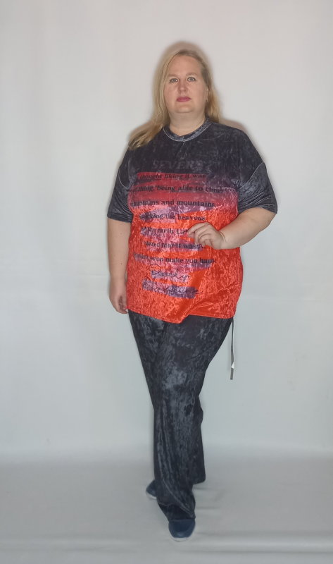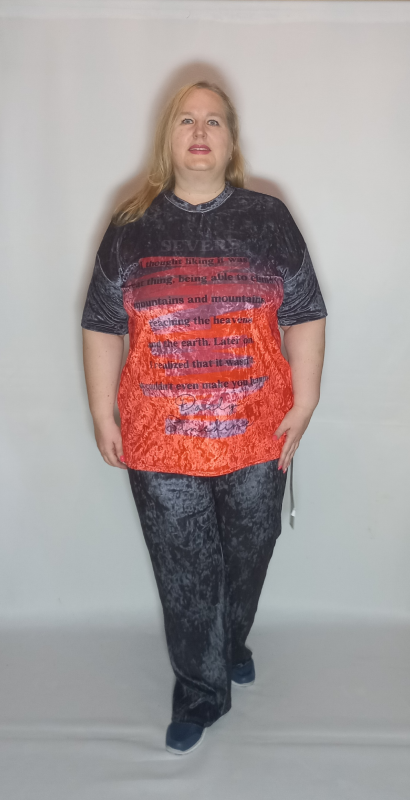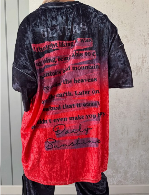 Шикарная туника- футболка выполнена из мягкого, очень эластичного мраморного велюра с рисунком амбре и тканным принтом.