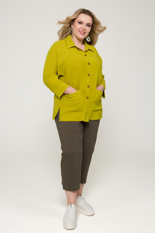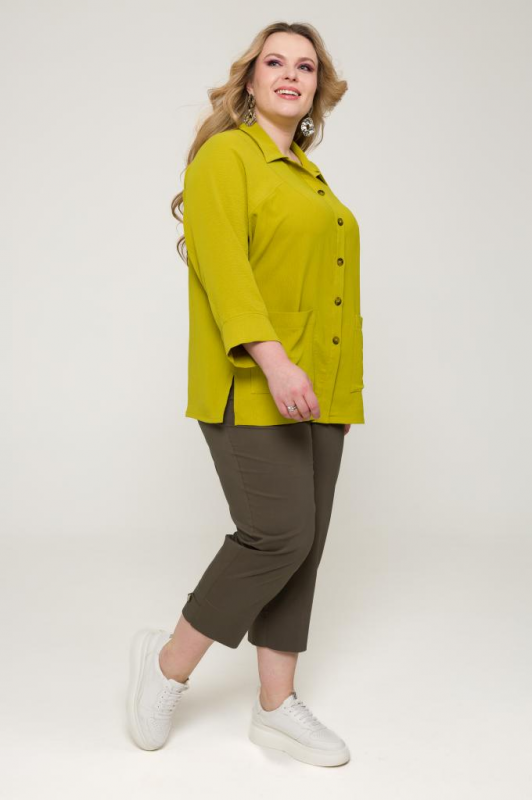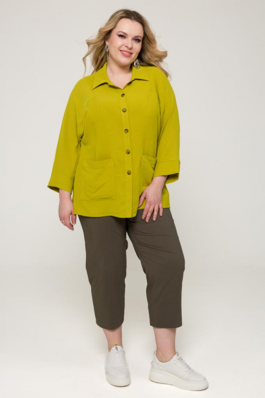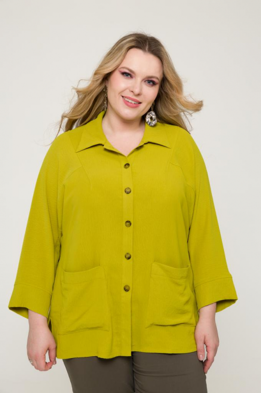 Летняя рубашка цвета лайм изготовлена из ткани “Сингапур”. Она обладает неярким блеском и на ощупь напоминает